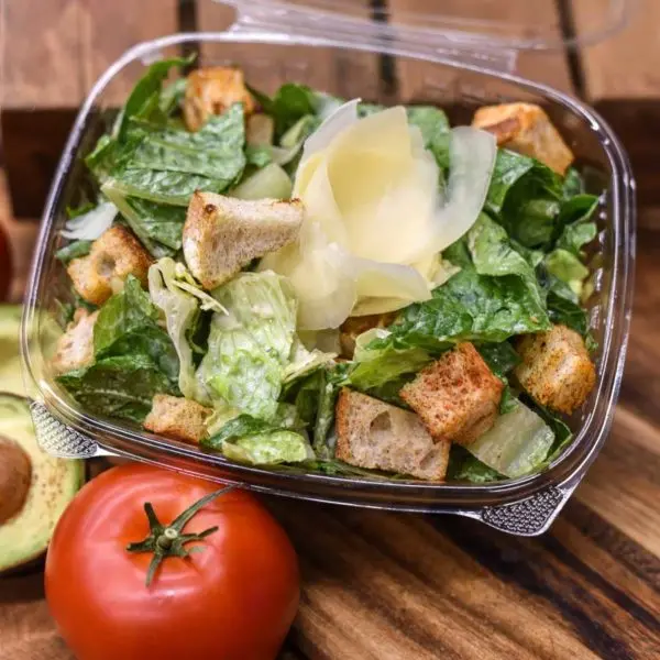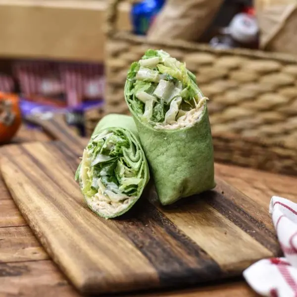 Chicken, romaine lettuce, shaved parmesan, caesar dressing, in a tortilla wrap