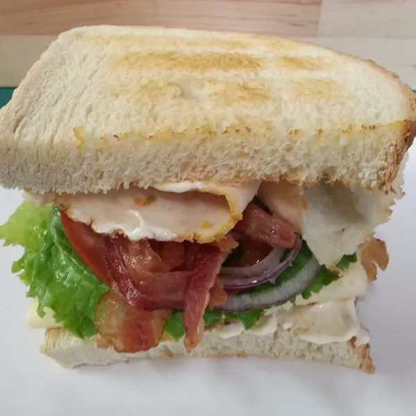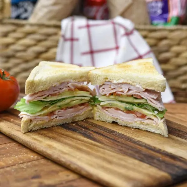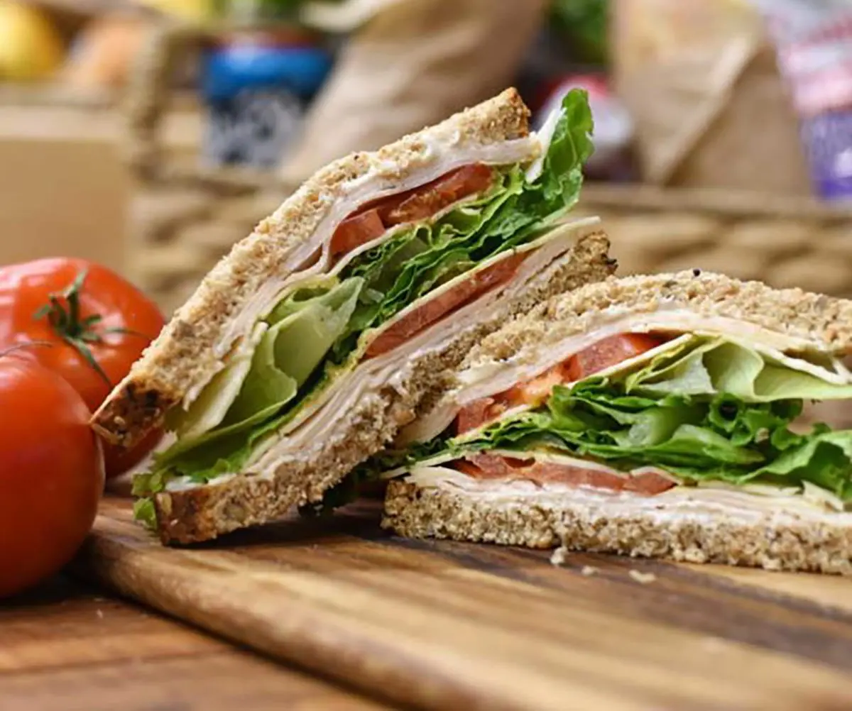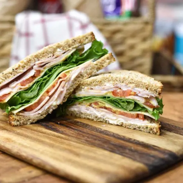 Turkey, english cucumber, Havarti, tomato, lettuce, veganaise and honey mustard on sourdough
