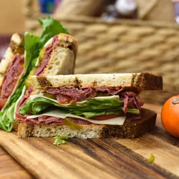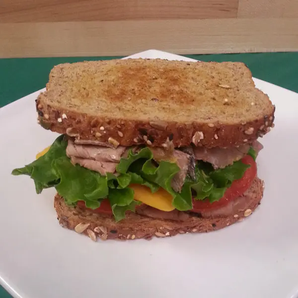Roast beef, cheddar, lettuce, tomato, mayo, deli mustard on Dave’s Killer wheat bread