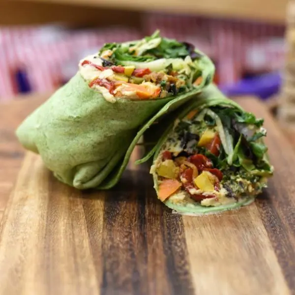 Snap peas, cremini mushrooms, carrots, bell peppers, zucchini, yellow squash, red onion, mixed greens, hummus in a tortilla wrap
